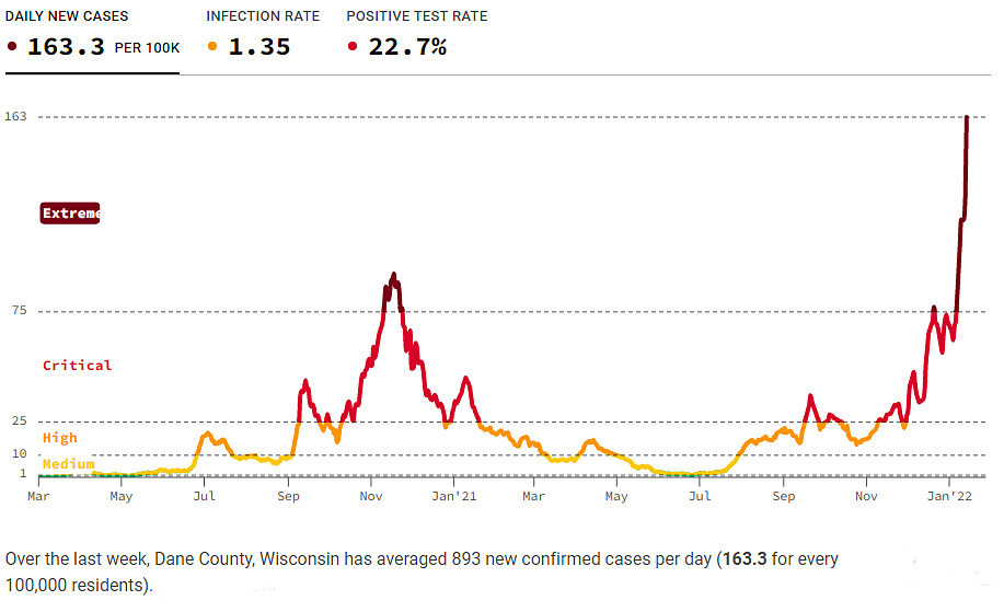 COVID risk level now SEVERE in Dane CountySat, 1/8/2022 — rwparkThe COVID risk level has risen to SEVERE in Dane County, with a positive test rate of over 20%. As shown in the graph below, the rate of daily new cases has risen from "critical" to "extreme," approaching the peak rate in November of 2020.
